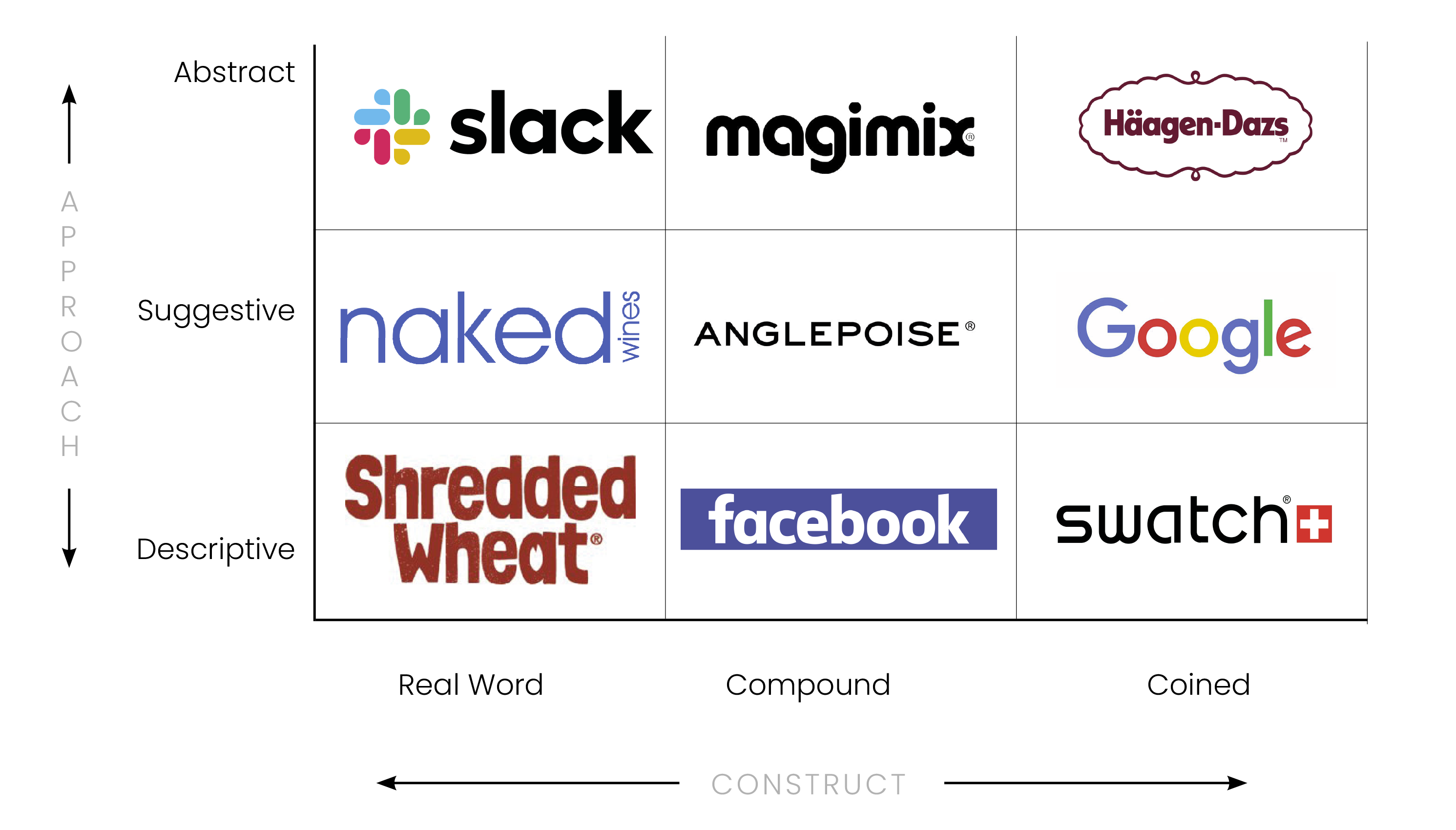 Before you begin generating brand name ideas, you can look at this framework that places names on an axis of Approach and Construct.