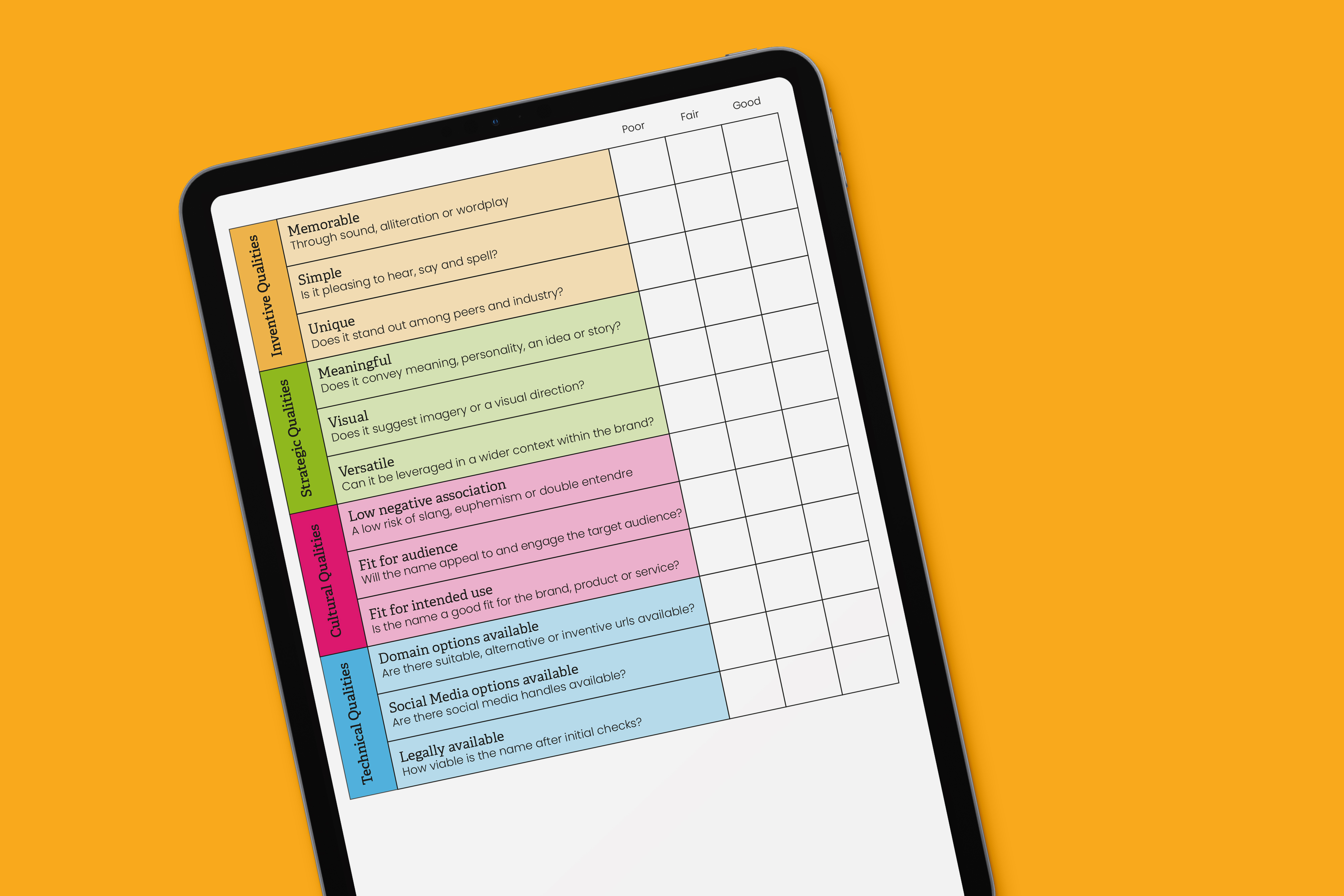 Once you have your long-list, how do you whittle it down? I use a slightly adapted 12-point naming criteria checklist (originally found in Rob Meyersons excellent book Brand Naming).